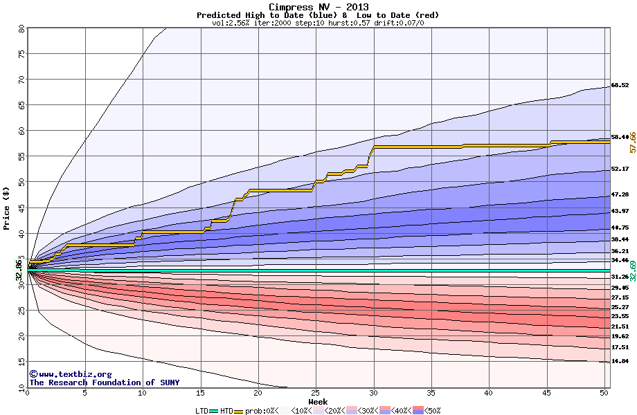 The following graph plots the year-to-date performance of the stock for 2013 compared to the probability calculated by a random walk model.