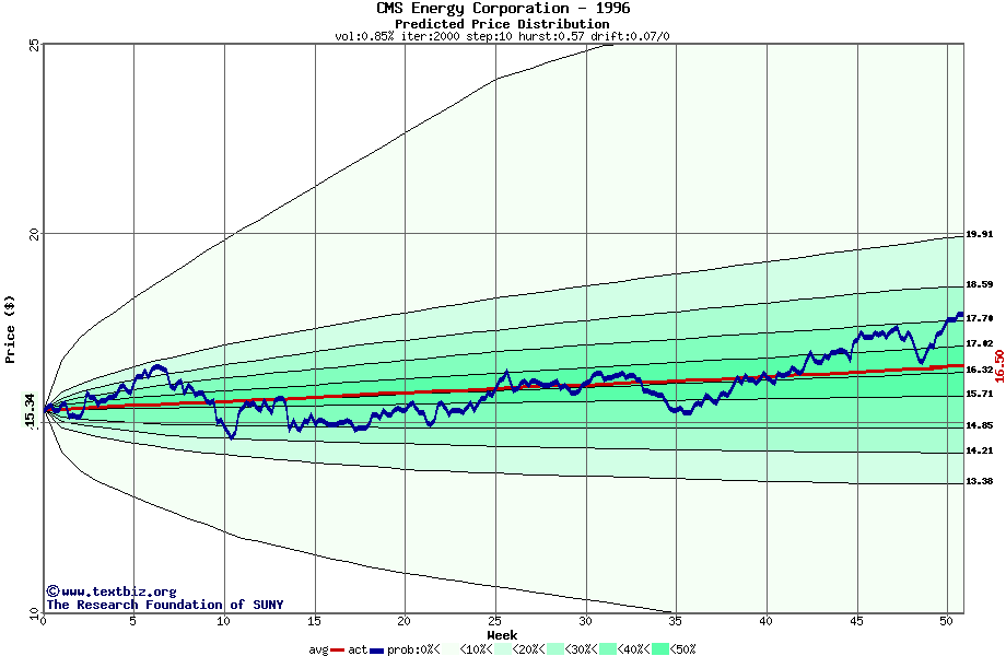 The following graph plots the year-to-date performance of the stock for 1996 compared to the probability calculated by a random walk model.