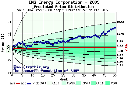 The high to date and low to date prices of the stock plotted against a random walk model for 2009 (what's this?).