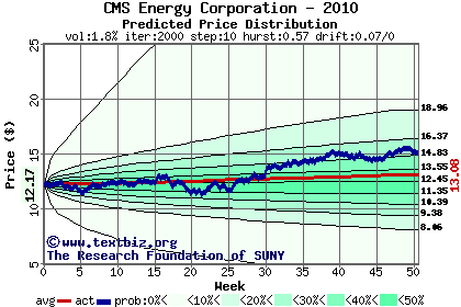 The high to date and low to date prices of the stock plotted against a random walk model for 2010 (what's this?).