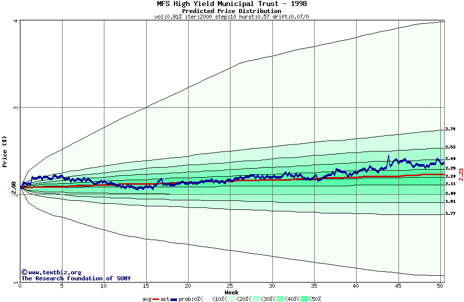 The high to date and low to date prices of the stock plotted against a random walk model for 1998 (what's this?).