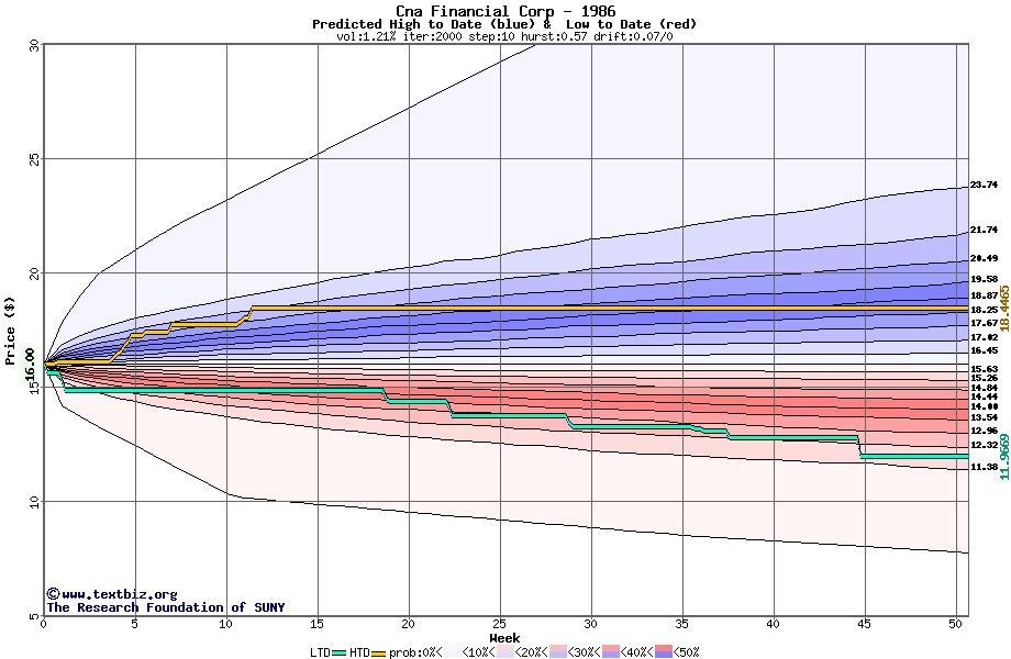 The high to date and low to date prices of the stock plotted against a random walk model for 1986 (what's this?).