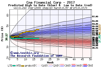 The high to date and low to date prices of the stock plotted against a random walk model for 2017 (what's this?).