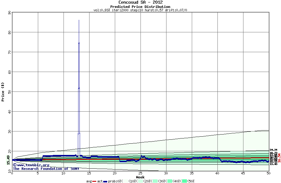 The following graph plots the year-to-date performance of the stock for 2012 compared to the probability calculated by a random walk model.