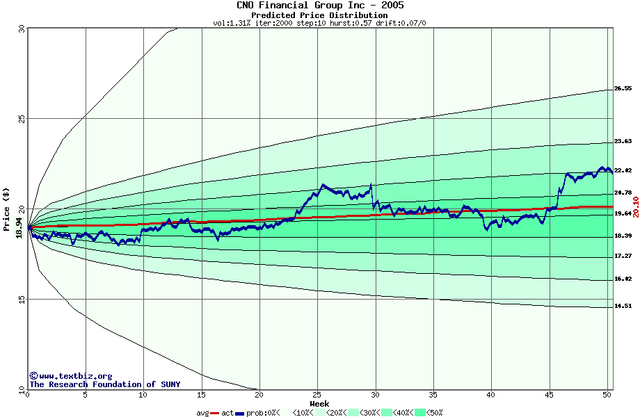 The following graph plots the year-to-date performance of the stock for 2005 compared to the probability calculated by a random walk model.