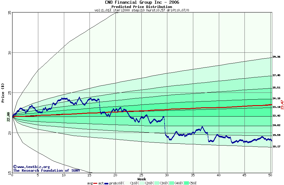 The following graph plots the year-to-date performance of the stock for 2006 compared to the probability calculated by a random walk model.