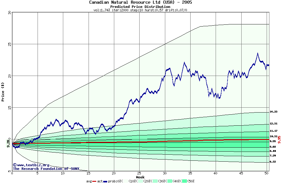 The following graph plots the year-to-date performance of the stock for 2005 compared to the probability calculated by a random walk model.