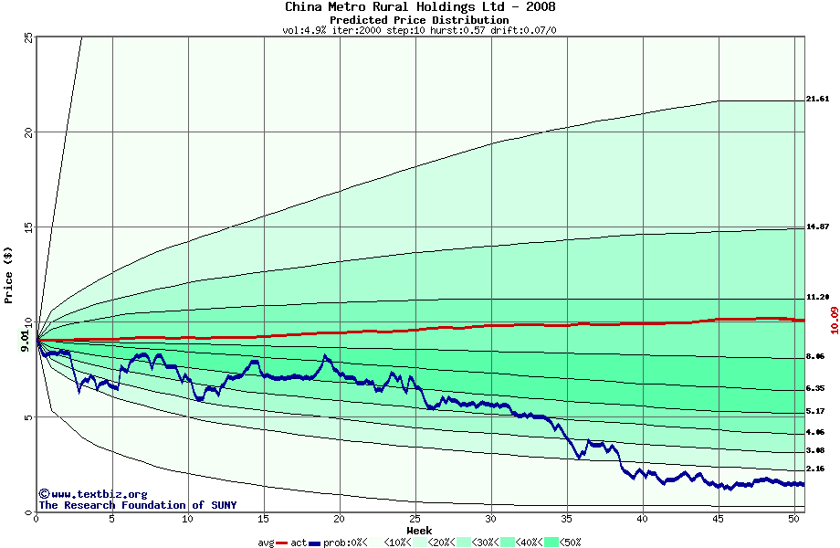 The following graph plots the year-to-date performance of the stock for 2008 compared to the probability calculated by a random walk model.