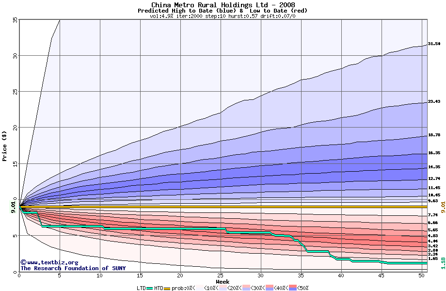 The high to date and low to date prices of the stock plotted against a random walk model for 2008 (what's this?).