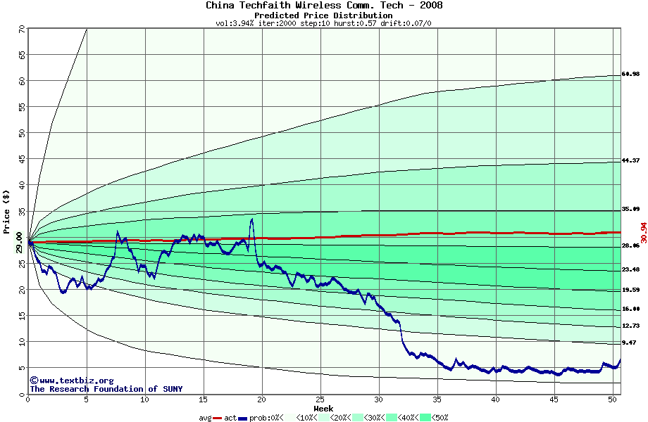 The following graph plots the year-to-date performance of the stock for 2008 compared to the probability calculated by a random walk model.
