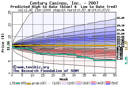 The high to date and low to date prices of the stock plotted against a random walk model for 2007 (what's this?).