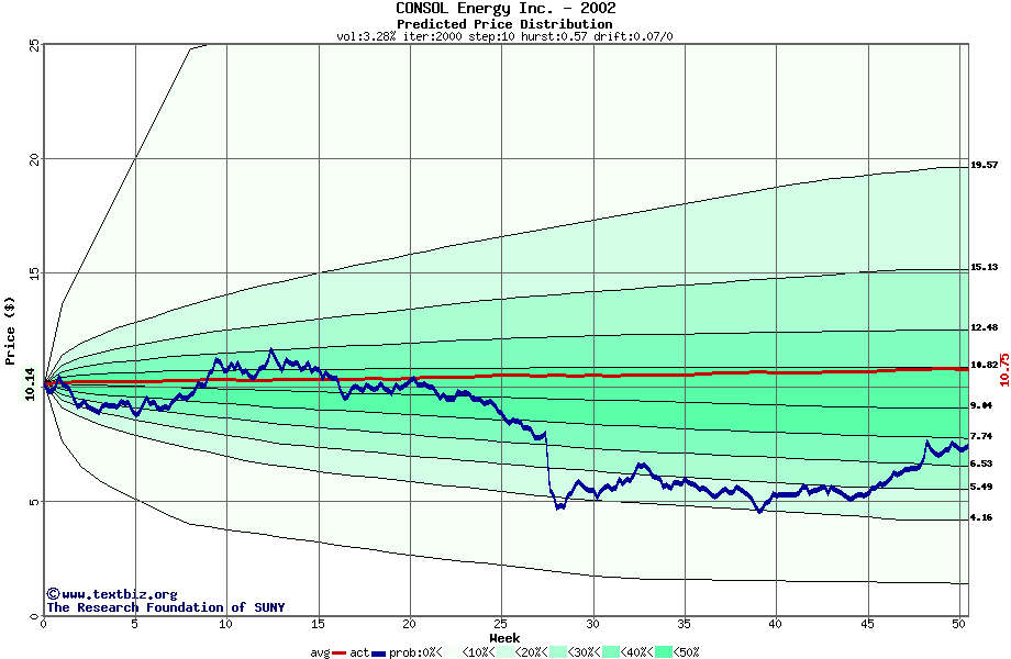 The following graph plots the year-to-date performance of the stock for 2002 compared to the probability calculated by a random walk model.