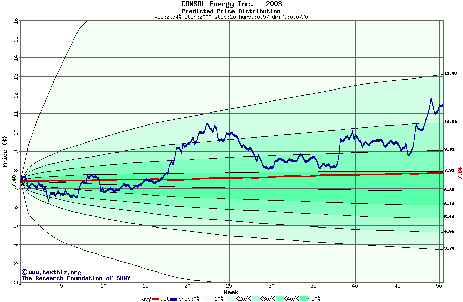 The following graph plots the year-to-date performance of the stock for 2003 compared to the probability calculated by a random walk model.