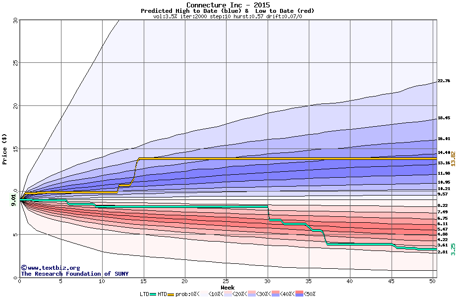 The high to date and low to date prices of the stock plotted against a random walk model for 2015 (what's this?).