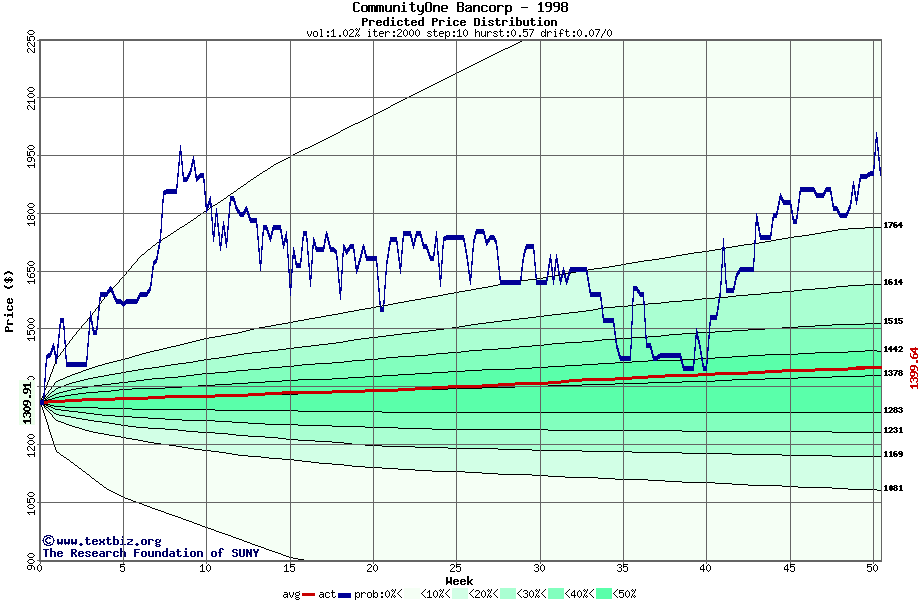 The following graph plots the year-to-date performance of the stock for 1998 compared to the probability calculated by a random walk model.