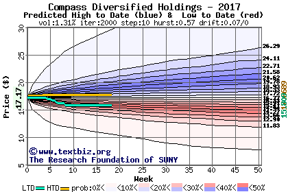 The high to date and low to date prices of the stock plotted against a random walk model for 2017 (what's this?).