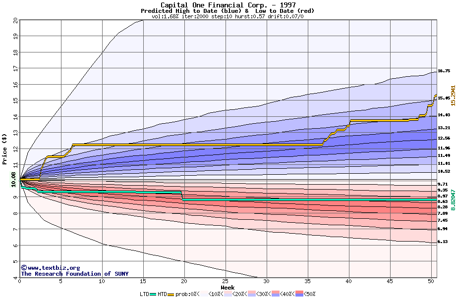 The high to date and low to date prices of the stock plotted against a random walk model for 1997 (what's this?).