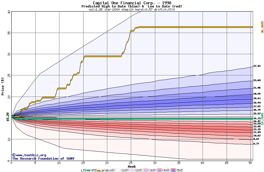 The high to date and low to date prices of the stock plotted against a random walk model for 1998 (what's this?).