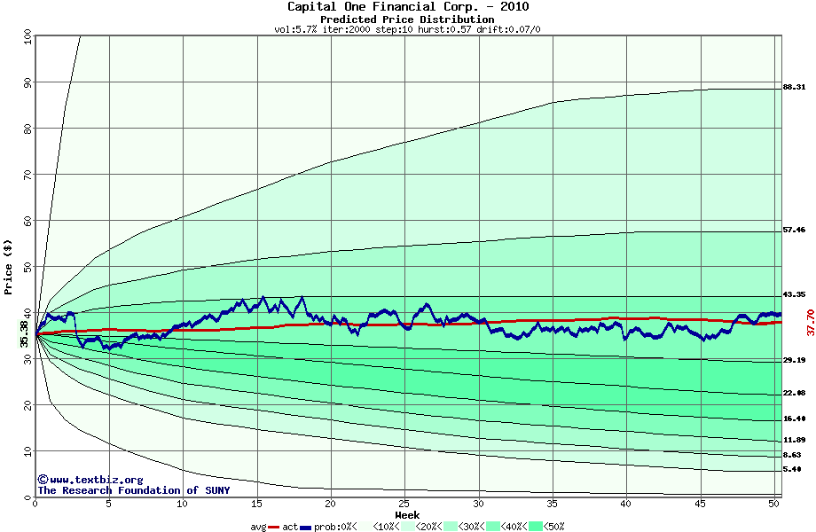 The following graph plots the year-to-date performance of the stock for 2010 compared to the probability calculated by a random walk model.