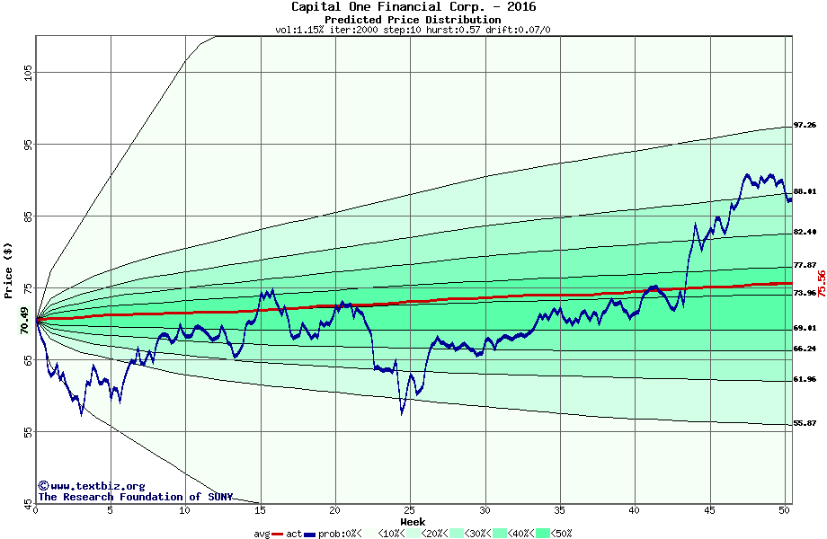 The following graph plots the year-to-date performance of the stock for 2016 compared to the probability calculated by a random walk model.