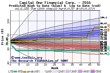 The high to date and low to date prices of the stock plotted against a random walk model for 2016 (what's this?).