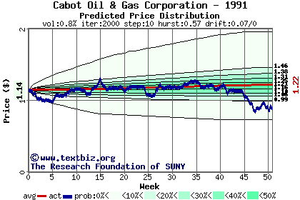 The high to date and low to date prices of the stock plotted against a random walk model for 1991 (what's this?).