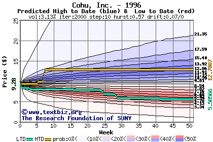The high to date and low to date prices of the stock plotted against a random walk model for 1996 (what's this?).