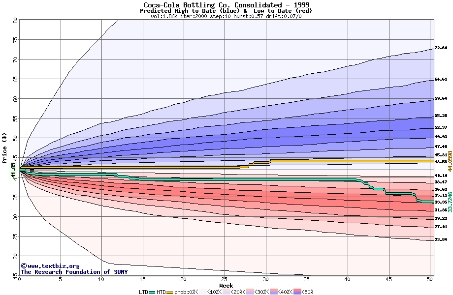 The high to date and low to date prices of the stock plotted against a random walk model for 1999 (what's this?).