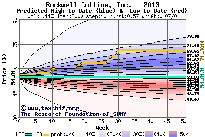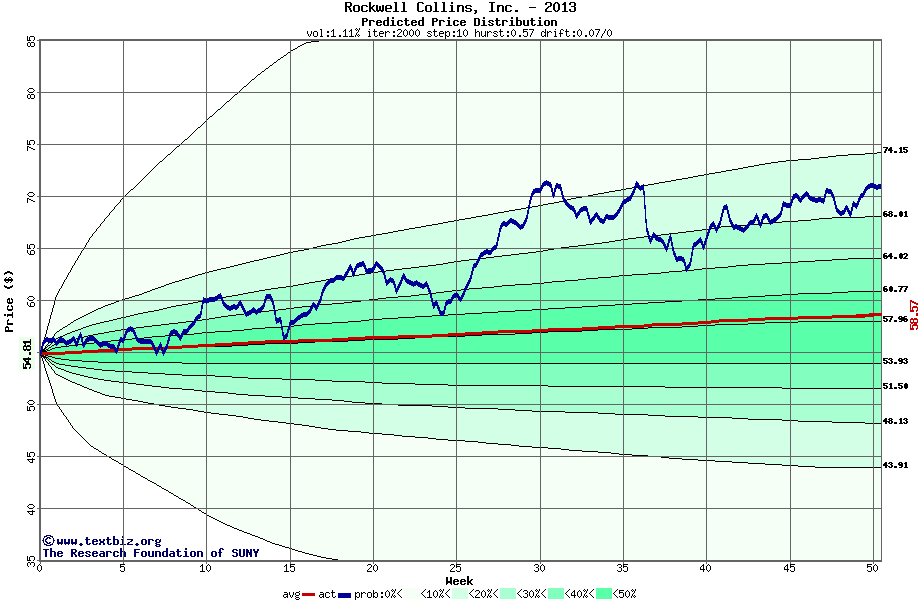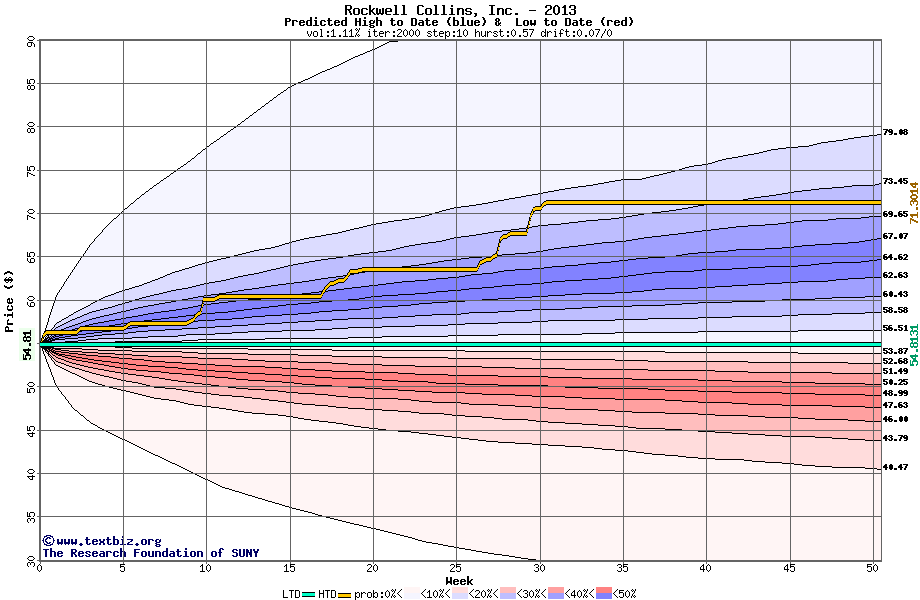 The following graph plots the year-to-date performance of the stock for 2013 compared to the probability calculated by a random walk model.