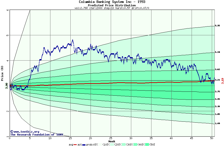 The following graph plots the year-to-date performance of the stock for 1993 compared to the probability calculated by a random walk model.