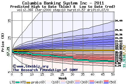 The high to date and low to date prices of the stock plotted against a random walk model for 2011 (what's this?).