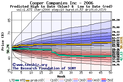 The high to date and low to date prices of the stock plotted against a random walk model for 2006 (what's this?).