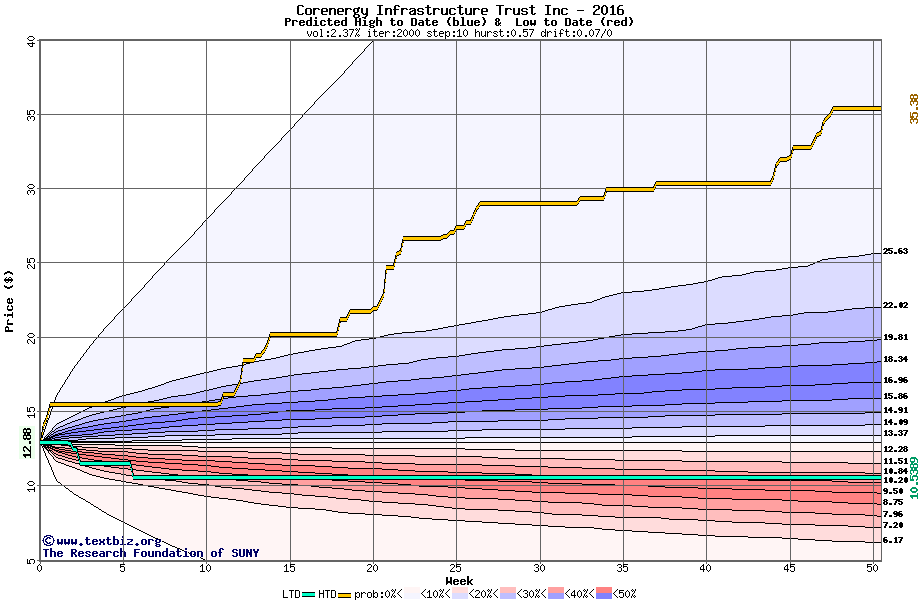 The high to date and low to date prices of the stock plotted against a random walk model for 2016 (what's this?).