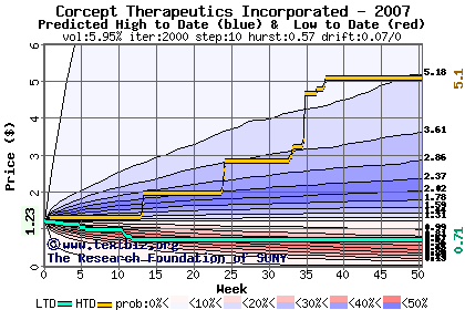 The following graph plots the year-to-date performance of the stock for 2007 compared to the probability calculated by a random walk model.