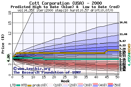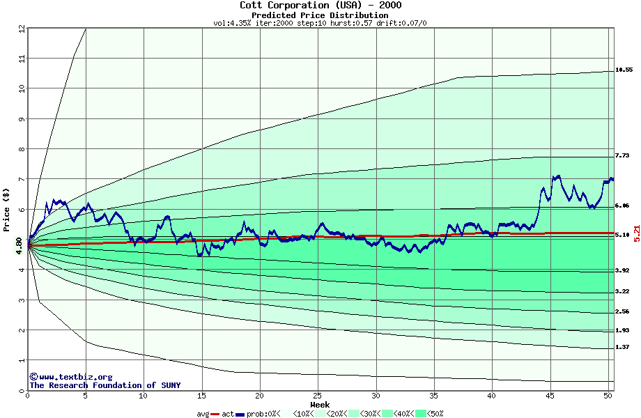 The high to date and low to date prices of the stock plotted against a random walk model for 2000 (what's this?).