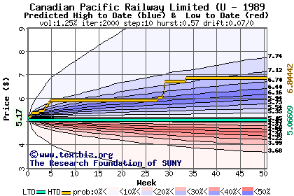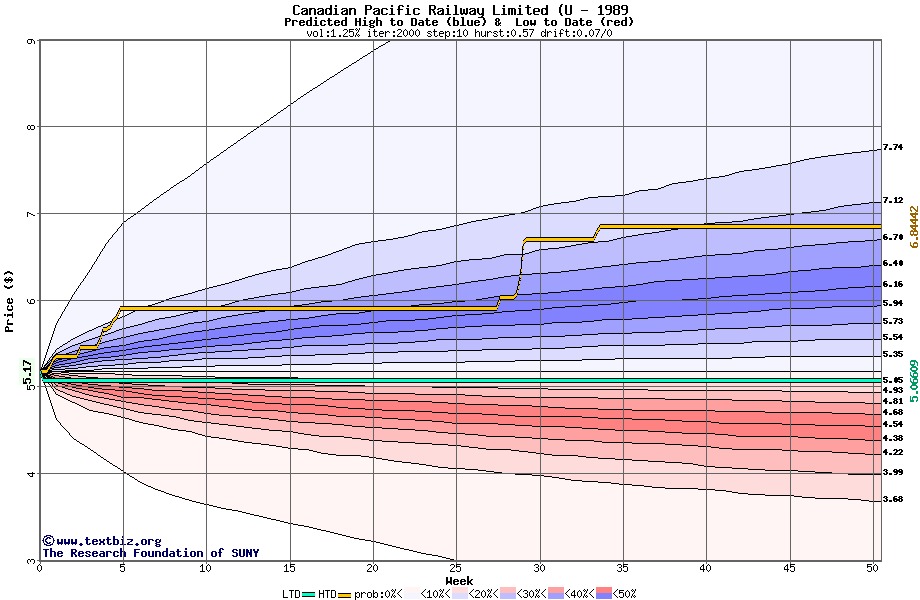 The high to date and low to date prices of the stock plotted against a random walk model for 1989 (what's this?).