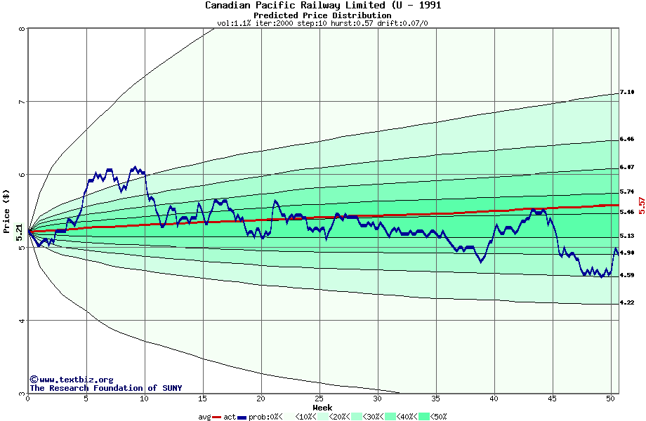 The following graph plots the year-to-date performance of the stock for 1991 compared to the probability calculated by a random walk model.