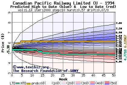 The high to date and low to date prices of the stock plotted against a random walk model for 1994 (what's this?).