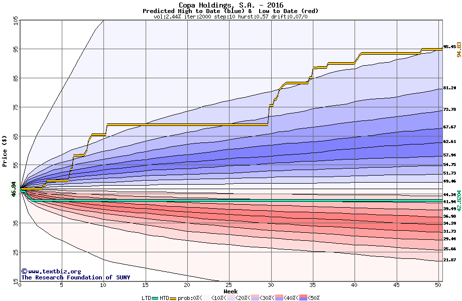 The high to date and low to date prices of the stock plotted against a random walk model for 2016 (what's this?).