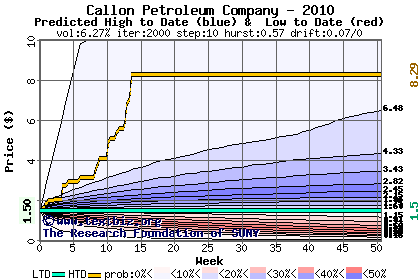 The high to date and low to date prices of the stock plotted against a random walk model for 2010 (what's this?).