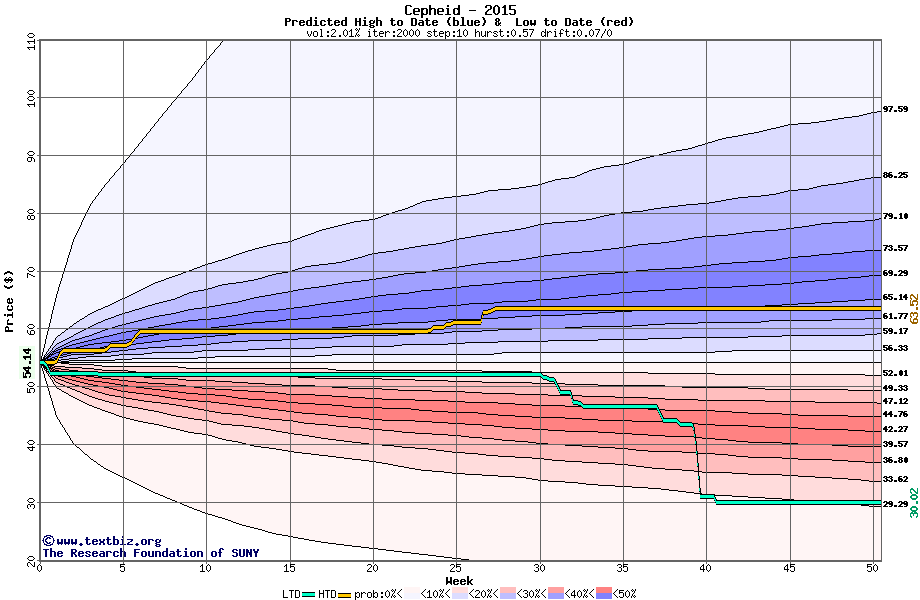The high to date and low to date prices of the stock plotted against a random walk model for 2015 (what's this?).