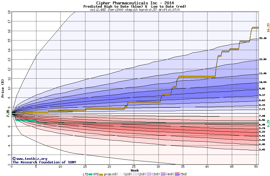 The high to date and low to date prices of the stock plotted against a random walk model for 2014 (what's this?).