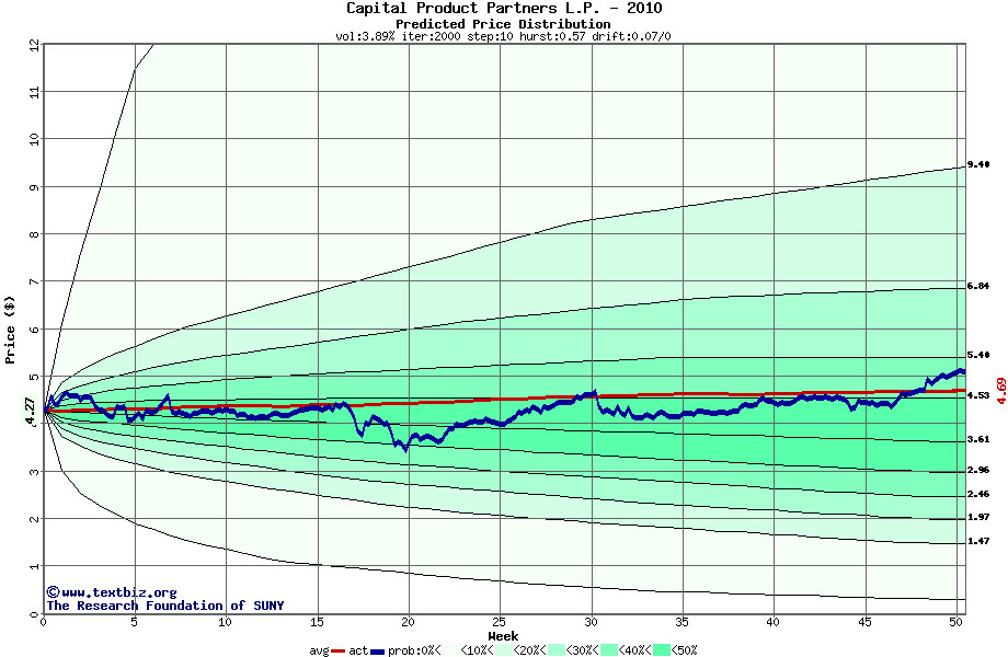 The following graph plots the year-to-date performance of the stock for 2010 compared to the probability calculated by a random walk model.