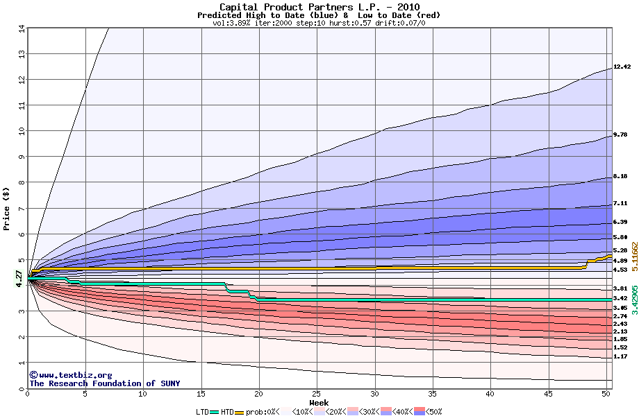 The high to date and low to date prices of the stock plotted against a random walk model for 2010 (what's this?).
