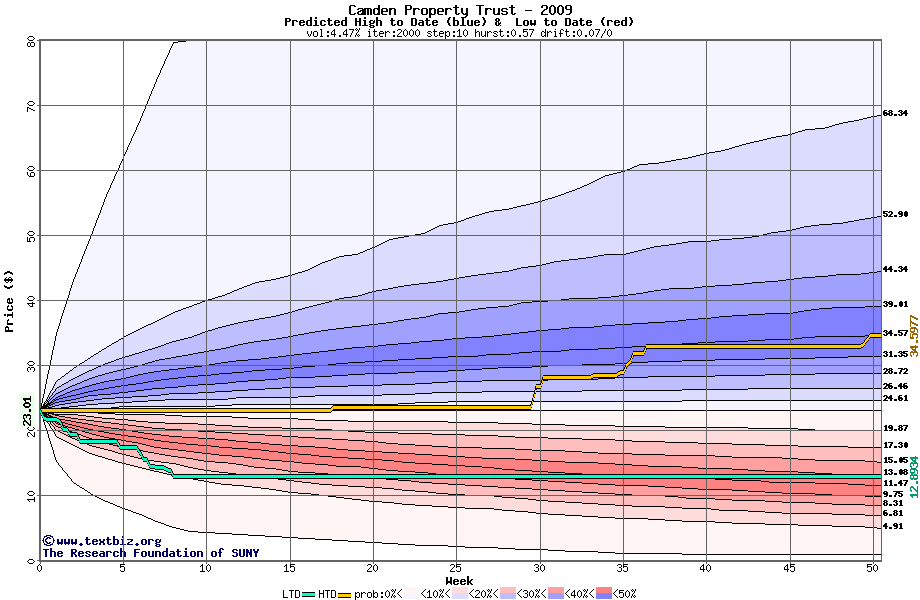 The following graph plots the year-to-date performance of the stock for 2009 compared to the probability calculated by a random walk model.