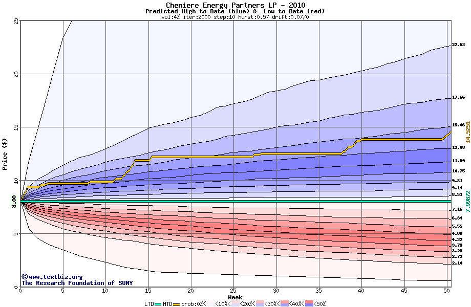 The high to date and low to date prices of the stock plotted against a random walk model for 2010 (what's this?).
