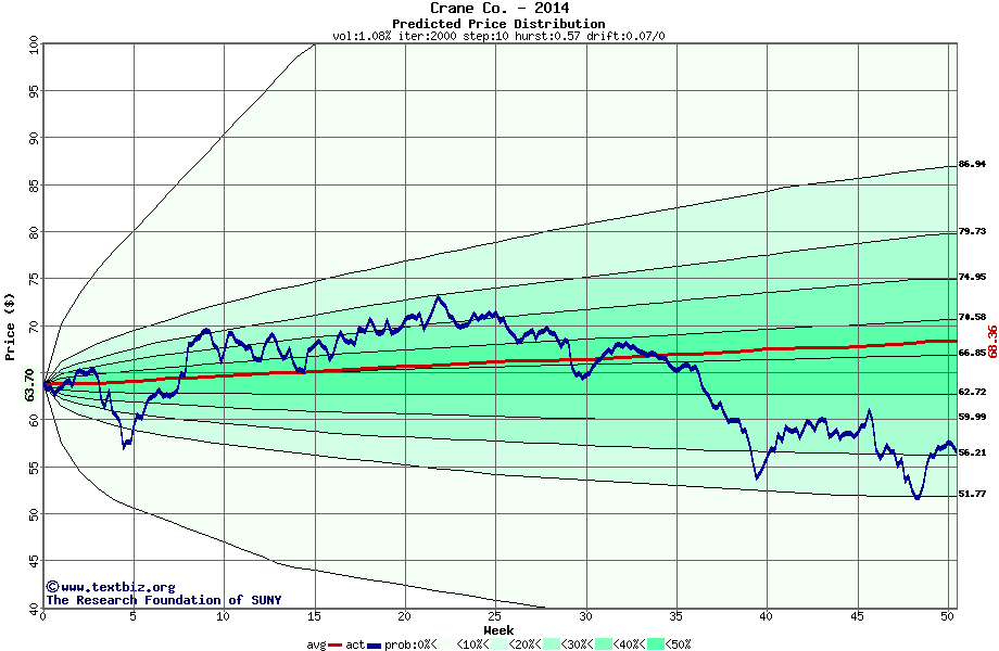The following graph plots the year-to-date performance of the stock for 2014 compared to the probability calculated by a random walk model.