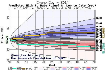 The high to date and low to date prices of the stock plotted against a random walk model for 2014 (what's this?).