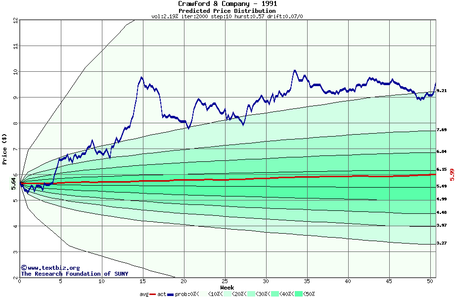 The following graph plots the year-to-date performance of the stock for 1991 compared to the probability calculated by a random walk model.