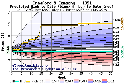 The high to date and low to date prices of the stock plotted against a random walk model for 1991 (what's this?).